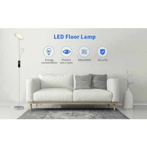 Lampadaire salon d’une platine LED intégrée de 30W avec une Liseuse 5W angle ajustable; la lampe principale s’allume vers le haut, équipée d’une tête rotative universelle 360º, qui peut éclairer différentes zones de la chambre; la lampe de lecture avec la hauteur et l’angle réglable, utilisation très pratique