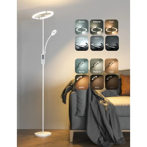 Lampadaire salon d’une platine LED intégrée de 20W avec une Liseuse 7W angle ajustable; la lampe principale s’allume vers le haut, équipée d’une tête rotative universelle 360º, qui peut éclairer différentes zones de la chambre; la lampe de lecture avec la hauteur et l’angle réglable, utilisation très pratique
