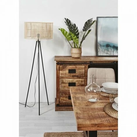 Lampadaire rotin pied métal – 48×150 cm – Abajour : 50x50x28,8 cm