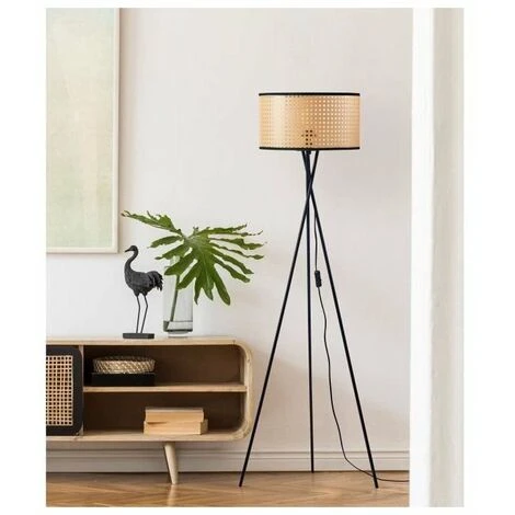 Lampadaire Trépied Métal Noir, Abat jour Imitation Cannage PVC Liseré Noir, Dimensions Diam 34x H14, ampoule E27 40W0