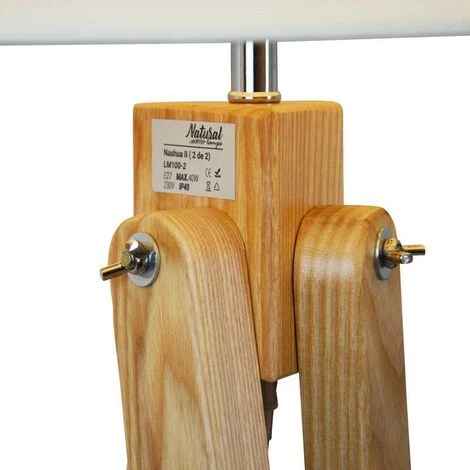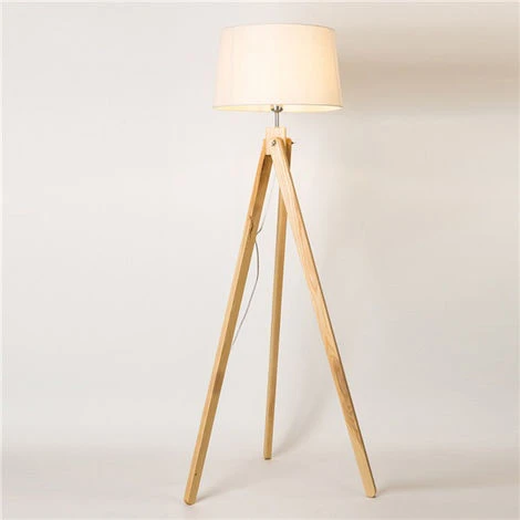 Lampadaire avec trépied en bois et abat-jour en tissu blanc crème, dans un style nordique minimaliste. Avec prise pour ampoule LED E27, et câble avec fiche et interrupteur noirs.