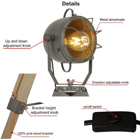 Lampe sur pied Tachicom avec tête de couleur noire. Idéal pour décorer votre maison ou votre magasin et donner un look vintage à la pièce. Vous pouvez y installer une ampoule de culot E27 jusqu’à 40W de puissance. Cette lampe est fabriquée en bois et en métal avec un trépied extensible de 10 cm.