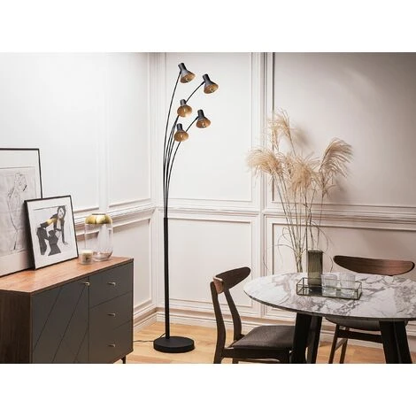 Lampadaire design 5 lumières noir et doré. Ce lampadaire design présente un style urbain et industriel très à la mode. Fait en métal robuste noir, il se compose de 5 bras ou branches terminées par des abat-jours dorés à l’intérieur. Ces derniers sont réglables et permettent de diriger la lumière sans effort dans l’endroit souhaité. Le style unique et original de cette belle lampe de salon en fait une pièce déco à part entière aussi bien pratique et fonctionnelle qu’élégante et très tendance.