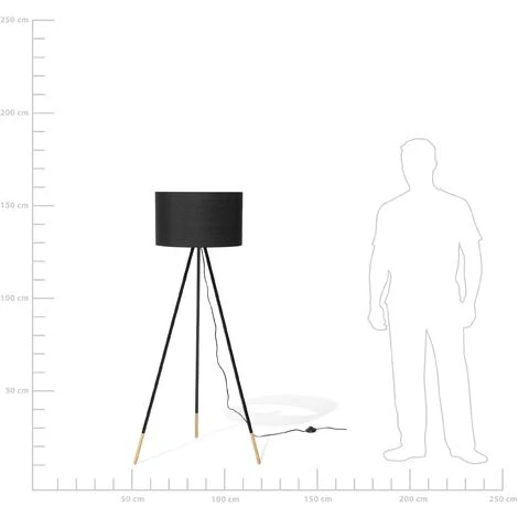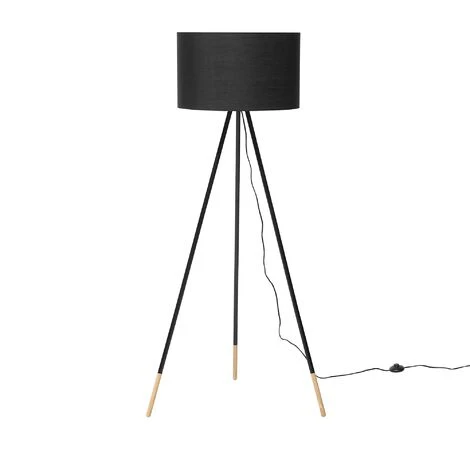 Lampadaire noir à trépied moderne. Une lumière vive et lumineuse rencontre un design tendance ! Ce lampadaire dégage une atmosphère lumineuse et conviviale. L’abat-jour rond et noir en tissu de haute qualité repose sur une structure à trois pieds en bois clair. Design charmant et lumineux !