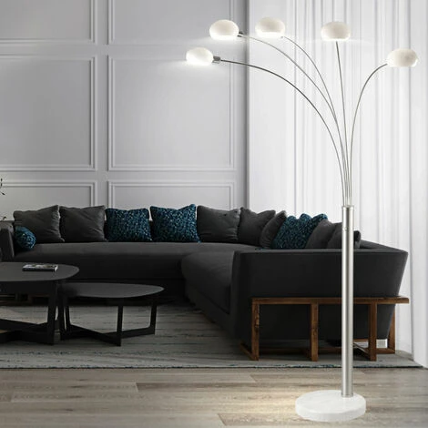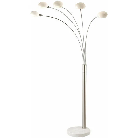 Description Élégant et moderne, c’est ce qui relie ce magnifique lampadaire nickel mat avec un marbre base.</ div> Les cinq spots attachés sont entourés d’abat-jour en verre et les douilles E14 vous permettent de décider vous-même quelle source lumineuse (max. 40W) vous vouloir utiliser ainsi aussi l’intensité lumineuse et la couleur de la lumière. Un variateur attaché et une taille de 210 cm complètent le tout. Les ampoules ne sont pas comprises dans la livraison. Détails • type de lampe : lampadaire