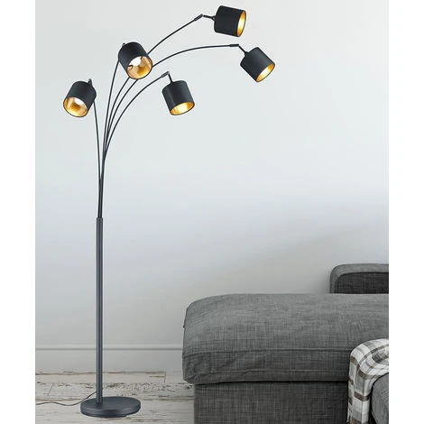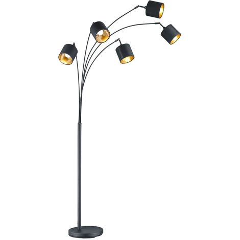 la description Ce lampadaire est synonyme d’une lumière chaleureuse, car les abat-jour en textile augmentent le facteur de confort et créent une ambiance chaleureuse. En même temps, les formes claires évoquent un style moderne et simple qui peut être utilisé et combiné de diverses manières. La lampe à cinq lampes a une hauteur de 200 cm et laisse briller les coins sombres dans une nouvelle splendeur. Elle sert idéalement de source lumineuse d’appui et trouve sa place dans les espaces de vie modernes. Les têtes pivotantes peuvent également être orientées de manière ciblée afin de mettre délibérément en évidence des zones individuelles. La lampe est en métal noir mat et est complétée par cinq abat-jour en tissu dans la combinaison de couleurs moderne noir et or. La combinaison crée des accents lumineux élégants et donne aux espaces de vie un effet de bien-être extraordinaire. L’utilisation d’une source lumineuse LED est recommandée pour un éclairage à économie d’énergie. Celles-ci constituent une alternative optimale aux lampes halogènes conventionnelles et garantissent une haute qualité de lumière et des économies d’énergie allant jusqu’à 80%. De plus, avec les lampes LED, vous bénéficiez d’une longue durée de vie, d’une faible génération de chaleur tout en protégeant l’environnement. Les ampoules ne sont pas comprises dans la livraison. Détails lampe • Type de lampe : lampadaire • Matière : métal, textile • Couleur : noir, or • Abat-jour pivotants • Interrupteur au pied • Degré de protection : IP20 • Diamètre x hauteur de l’abat-jour en cm : 12 x 11 • Largeur x hauteur en cm : 71,5 x 200 • Douilles : 5 x E14 • Ampoules incluses : non • Ampoules de puissance : 5 x 28 watts max. • Alimentation : 230 V, 50 Hz