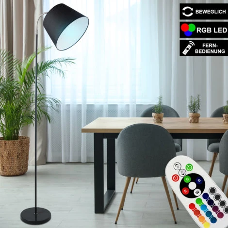 Description Ce lampadaire simple fait bonne figure dans n’importe quelle pièce. La lampe noire s’adapte à sa hauteur confortable de 142 cm bien dans les petites pièces. L’abat-jour en textile noir est blanc à l’intérieur, ce qui reflète parfaitement la lumière. A l’aide de la télécommande fournie, l’illuminant LED RGB peut être réglé en différentes couleurs et fournit ainsi un éclairage d’ambiance. Par rapport aux lampes normales, les projecteurs à LED consomment une quantité minimale d’électricité et sont encore plus faibles que les lampes à économie d’énergie. Cela protège l’environnement et votre portefeuille. Une lampe LED RVB de haute qualité à économie d’énergie avec télécommande pour la lumière blanche et le contrôle RVB est incluse dans le contenu de la livraison.</ div> Détails lampe • Type de lampe : lampadaire• matériau : métal, plastique, noir, chrome• abat-jour lamellaire : textile, noir , blanc• Flexo neck• switch• classe de protection : IP20• diamètre plaque de base x hauteur en cm : 22 x 2,2• diamètre abat-jour x hauteur en cm : 26 x 18• hauteur totale en cm : 142 • douille : 1x E14• ampoules incluses : oui• Ampoules de puissance : 1x 3,5 Watt• Flux lumineux : 1x 320 lumens• Couleur de la lumière : blanc chaud• Télécommande : Uniquement pour la source lumineuse• tension : 230V, 50Hz détaille la source lumineuse • type de lampe : lampe à LED RVB