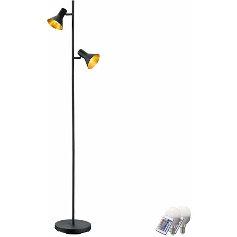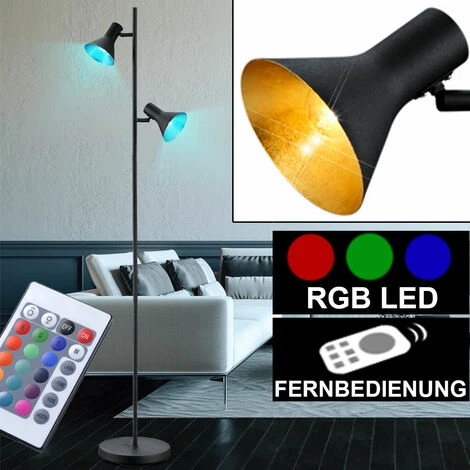 Description Lampadaire pour votre salon. Cette lampe de style vintage est un véritable accroche-regard et donne à votre maison un nouveau style. Le projecteur avec deux spots mobiles est en métal dans les couleurs noir et or et peut être facilement allumé et éteint à l’aide d’un interrupteur au pied. Le lampadaire fait particulièrement bonne figure comme éclairage latéral, par exemple dans le salon. À l’aide de la télécommande fournie, la lampe peut être réglé dans différentes couleurs et garantit ainsi un éclairage d’ambiance.