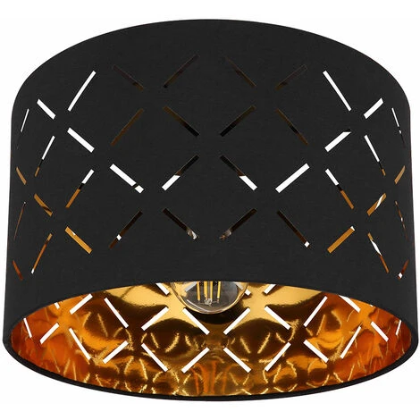 Description Ce plafonnier cylindrique (ø 30 cm) est un merveilleux ajout à votre intérieur. Le plafonnier de 21 cm se compose d’un abat-jour en textile noir, qui présente un motif symétrique de perforations en forme de ligne et est teinté d’or à l’intérieur. Vous pouvez équiper la douille E27, qui est encadrée par l’abat-jour textile, d’une source lumineuse adaptée de votre choix, ce qui vous permet de déterminer individuellement la couleur et la luminosité de la lumière. Avec d’autres modèles de cette série, vous pouvez compléter l’image globale dans vos quatre murs. Nous les recommandons en raison de leurs économies d’énergie et de la durabilité des LED. La lampe n’est pas incluse dans la livraison. Détails lampe • type de lampe : plafonnier• matériau : métal, textile</ div>• couleur : noir, couleur or• classe de protection : IP20• diamètre x hauteur en cm : 30×21 douille • : 1x E27ampoules • incluses : nonampoules • puissance : 1x 40 watt max.• alimentation : 220-240V, 50-60Hz