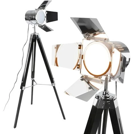 Présentation produit: Lampadaire trépied type projecteur de cinéma hauteur réglable bois et métal classe énergétique led rétro lampe sur pied pour salon noir mat