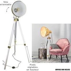 Créez une déco tendance digne des célèbres plateaux de cinéma avec ce lampadaire bicolore réalisé en métal et en bois. Vous apprécierez sa tête orientable ainsi que le parfait équilibre de son trépied. Pensez à le moduler pour l’adapter au mieux à vos besoins avant d’opter pour l’ampoule de votre choix. il sera incontestablement l’atout charme de votre déco ! Détail : Longueur de câble 2.20 m – Hauteur maximale du luminaire 1.50 m – Dimensions de l’abat jour 30×30 cm – Fonctionne avec une ampoule E27 10 W max non incluse.