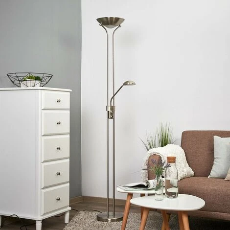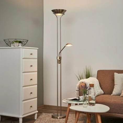 Le lampadaire LED Josefin combine une lampe à éclairage indirect et une liseuse et est donc une lampe fonctionnelle pour le salon. Les deux variateurs permettent un réglage en continu de la luminosité.