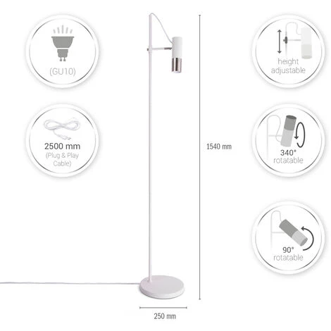 Dénué de formes tape-à-l’œil et de couleurs voyantes, cet élégant lampadaire constituera une source d’éclairage agréable dans votre pièce préférée et fera également bonne impression en tant qu’objet de design sobre. Conçu dans une forme discrète et moderne et des couleurs classiques, comme le noir ou le blanc, et rehaussé d’une application métallique, cet accessoire sera parfait pour tous les styles d’intérieur et conviendra à chaque pièce. Réglable en hauteur, sa tête orientable et inclinable mettra superbement votre mobilier en valeur ou diffusera simplement une lumière d’ambiance agréable.