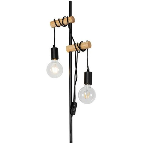 QAZQA Lampadaire Country noir avec bois 2 lumières – Dami