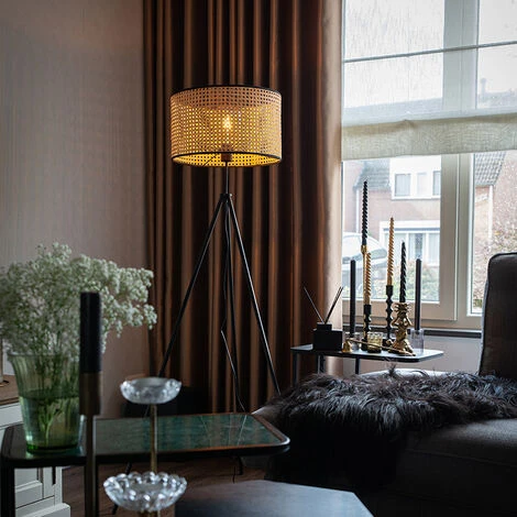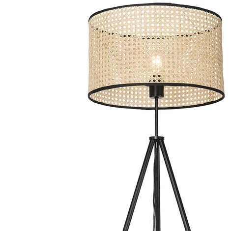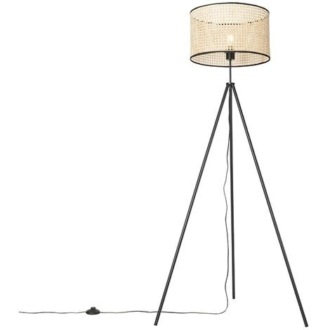 QAZQA Lampadaire rural trépied noir avec abat-jour en rotin – Kata