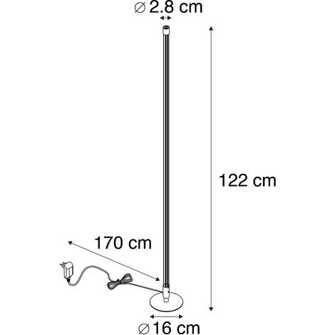 La lampe a un diamètre de 2,8 cm et une hauteur de 122 cm. Le pied a un diamètre de 16 cm. Le cordon a une longueur de 170 cm. La lampe a 12 Watts, 960 lumens, 2700 Kelvin et 30000 heures de fonctionnement.