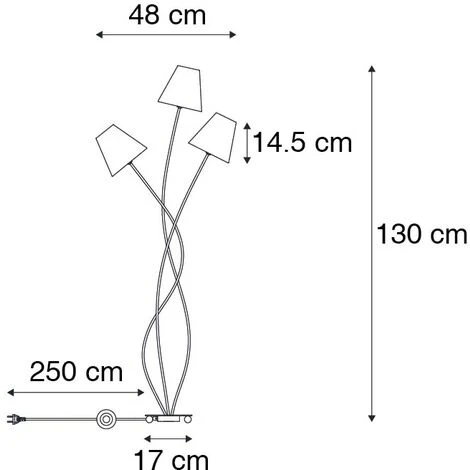 Egayez votre intérieur avec le lampadaire Melis. En raison de son beau design, le lampadaire s’intègre le mieux dans un intérieur design. Les 3 points lumineux, s’entourant comme une fleur, forment néanmoins un tout. Melis est en acier avec des revêtements en tissu. Le luminaire est fini en noir, les trois nuances ont une couleur grise, brune et blanche. La combinaison de couleurs est bien coordonnée, de sorte que la lampe s’intègre dans n’importe quel intérieur. Le lampadaire a une hauteur de 130 cm, une longueur de 48 cm et une largeur de 17 cm. Le pied a une hauteur de 2,8 cm, une longueur de 17 cm et une largeur de 17 cm. Les abat-jour ont chacun un diamètre de 16 cm et une hauteur de 14,5 cm. Le cordon fourni a une longueur de 250 cm. Vous complétez le lampadaire en commandant 3 sources lumineuses, chacune avec un culot E14 (max. 40 Watt). Le lampadaire est dimmable avec un variateur externe, qui n’est pas inclus. Melis est un magnifique lampadaire pour le salon, la salle à manger ou le bureau.