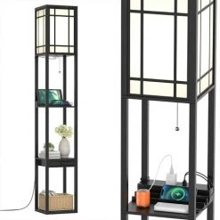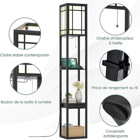 - Moderne et simple, notre lampadaire comporte trois étagères de rangement, un tiroir et une zone de chargement (2 ports USB et une prise 120V)