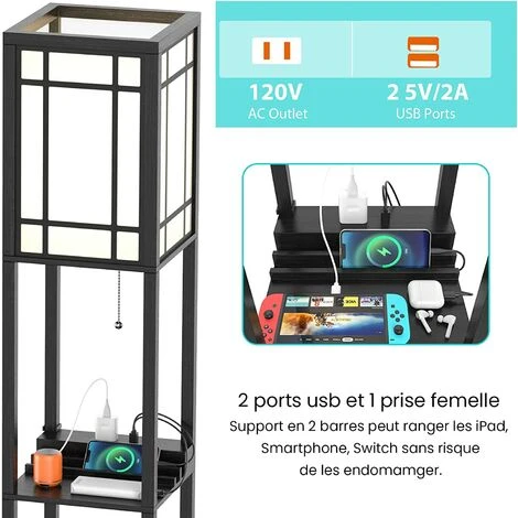 - ★2 PORTS USB ET 1 PRISE FEMELLE★Conçu pour une grande commodité, notre lampadaire salon est équipé de 2 ports usb 2.5V/2A et 1 prise femelle 120V ce qui permet de recharger vos appareils mobiles à votre portée. 1 prise femelle vous permet de charger les iPhones, les appareils Android etc. Le support en 2 barres peut ranger les iPad, Smartphone, Switch sans risque de les endomamger. Et les câbles de charge ne s’emmêlent pas.
